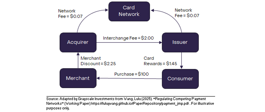 Grayscale Research cree que las stablecoins pueden interrumpir aspectos de la industria de pagos globales al ofrecer costos más bajos, tiempos de liquidación más rápidos y mayor transparencia. Esperamos que las stablecoins logren las mayores penetraciones en (1) pagos transfronterizos; (2) pagos nacionales en mercados dominados por tarjetas de crédito, como EE. UU.; y (3) la transferencia de valor entre agentes de inteligencia artificial (IA). Las stablecoins también son una forma de mantener valor digital y pueden en parte desintermediar los depósitos bancarios comerciales. Dentro del ecosistema cripto, los mayores beneficiarios probablemente serán los emisores de stablecoins y sus socios de distribución, que obtienen margen neto de interés (NIM), así como blockchains en el ecosistema Ethereum, ciertas otras capas 1 de alto rendimiento y aplicaciones DeFi relacionadas como oráculos e intercambios descentralizados (DEXs).