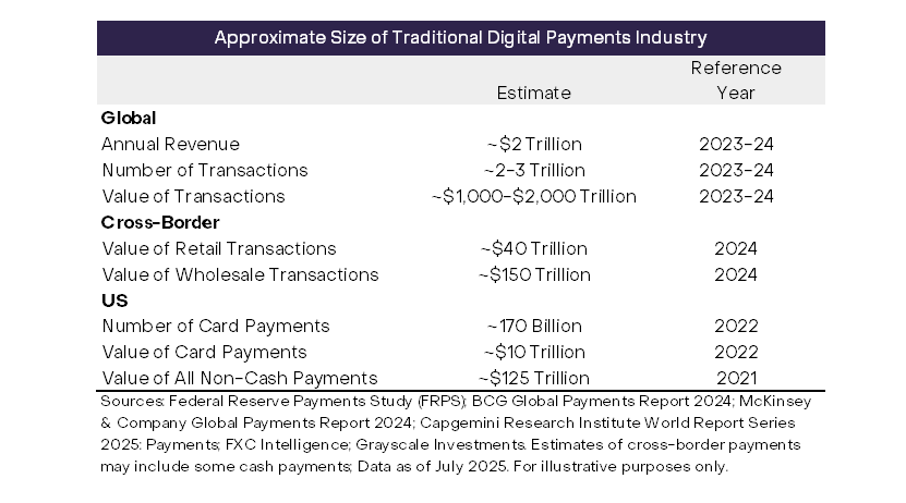 El mercado global de pagos maneja entre 1 y 2 cuatrillones de dólares al año y genera más de 2 billones en ingresos. Hoy las stablecoins representan apenas el 0.05% de ese volumen.
