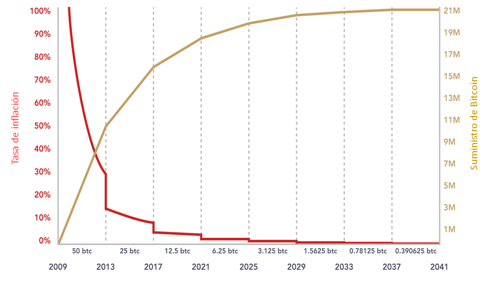 En primer lugar, recordemos que lo que convierte a Bitcoin en un bien escaso es que su oferta se encuentra limitada a 21 millones de monedas, y que cada 4 años desde su creación, la cantidad de monedas que se emiten por bloque creado se ha venido reduciendo a la mitad. En el siguiente gráfico podemos ver cómo desde Abril del 2024, cuando se produjo el último halving, la emisión es de sólo 3.125 bitcoins por bloque emitido. Esto no nos dice demasiado si no consideramos que la cantidad de bitcoins emitidos hasta la fecha ya es de casi 20 millones. Esto quiere decir que, solo quedan emitirse 1 millón de bitcoins, es decir, más del 95% de la oferta de bitcoin ya ha sido emitida.