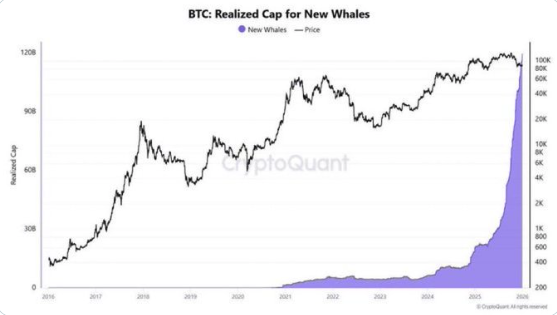 Este flujo ha generado un «choque de fuerzas» en el mercado: la tenencia de Bitcoin está migrando de holders originales hacia inversores tradicionales que lo ven como un asset de largo plazo. Datos sobre la acumulación por nuevas ballenas indican la entrada de capital grande y fresco, no simplemente una redistribución entre participantes históricos del ecosistema.