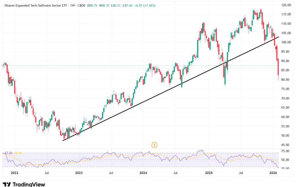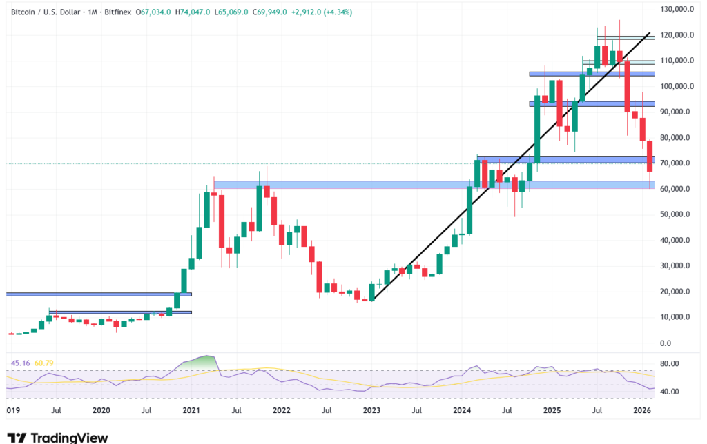 Durante febrero, Bitcoin extendió la debilidad que ya se había visto en enero y volvió a comportarse más como un activo de beta tecnológica que como “digital gold”. La corrección de comienzos de mes coincidió con un fuerte desarme en software y growth stocks por temores de disrupción vinculados a la IA, un movimiento que llegó a borrar cerca de US$1 billón de valor de mercado en el índice de software y servicios del S&P 500 desde fines de enero. En el gráfico mensual, BTC perforó el soporte lateral de la zona de 70.000usd y fue a testear la zona de USD 60.000, un nivel técnicamente muy relevante porque coincide con el área de máximos del ciclo previo y con la base del rango post-elección. Hacia el cierre del mes el precio logró estabilizarse, pero con un tono todavía frágil: el RSI mensual siguió deteriorándose y la lectura general es la de un mercado que pasó de una fase de euforia a otra de compresión y búsqueda de piso, aún sin una señal definitiva de reversión.