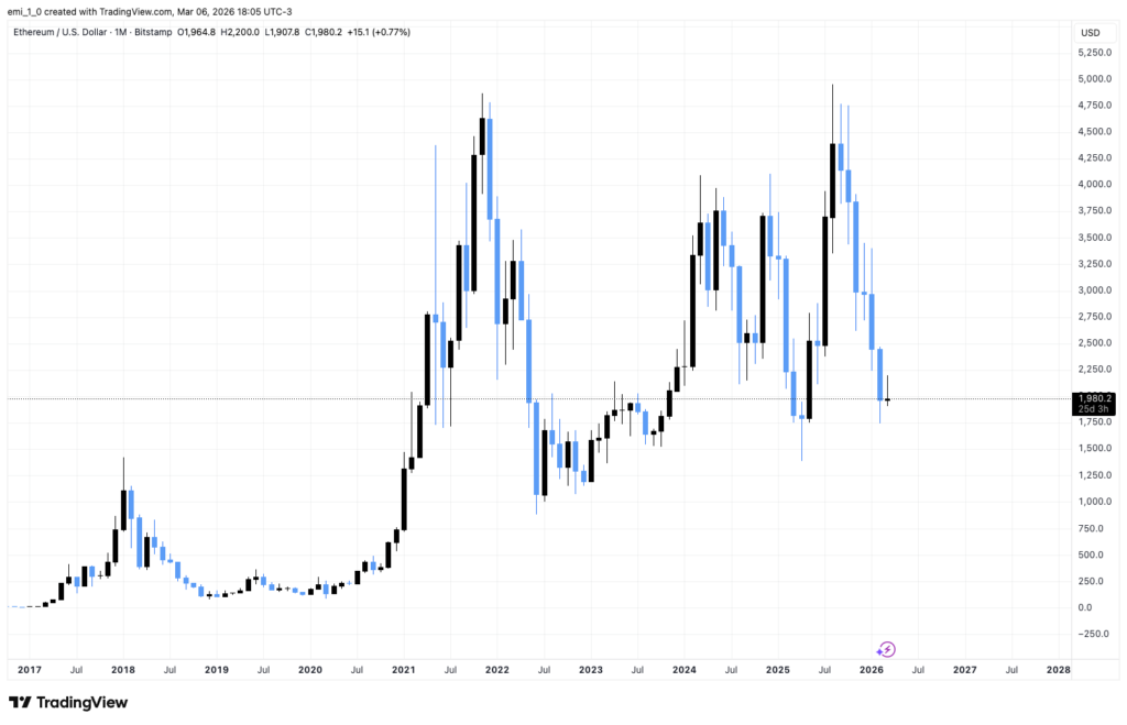 El precio de Ethereum frente al dólar ha atravesado un período claramente negativo en los últimos meses. Desde su último pico cercano a los $4.800–$5.000, ETH acumula aproximadamente seis meses consecutivos de caídas, llevando el precio nuevamente a la zona de los $2.000. Este tipo de correcciones prolongadas suelen aparecer en momentos donde el mercado reduce riesgo y los inversores priorizan liquidez. Sin embargo, este comportamiento del precio contrasta con los fundamentos del protocolo, que siguen fortaleciéndose: Ethereum continúa siendo la infraestructura principal para stablecoins, aplicaciones financieras descentralizadas y nuevos desarrollos tecnológicos, con una actividad de desarrollo y uso de la red que permanece muy sólida a pesar del contexto bajista del mercado.