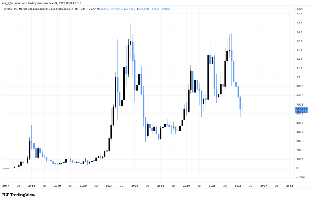 Durante el último mes, el sector de altcoins se mantuvo débil en relación a Bitcoin. Cuando el mercado entra en fases de corrección o incertidumbre, el capital suele refugiarse primero en el activo percibido como más sólido dentro del ecosistema: Bitcoin. Esto genera que la mayoría de las altcoins caigan con más fuerza o tarden más en recuperarse. Uno de los indicadores que seguimos para evaluar la salud general de las altcoins es TOTAL2ES, que mide la capitalización total del mercado sin incluir Bitcoin y excluyendo las monedas estables. En los últimos meses este indicador ha mostrado debilidad y falta de impulso comprador, señal de que el mercado de altcoins en conjunto todavía no ha encontrado un piso claro.