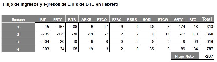 En términos de flujos, si bien los flujos netos volvieron a ser negativos, febrero dejó una señal algo más constructiva de cara al corto plazo. Las primeras tres semanas de salidas entre 300 y 400 millones de dólares por semana, fueron parcialmente revertidas por una fuerte entrada en la última semana del mes. Ese cambio de signo es importante porque aparece justo cuando el precio fue a testear la zona de USD 60.000, sugiriendo que allí comenzó a reactivarse la demanda institucional. CoinShares señaló que esta última semana trajo un primer indicio más positivo, con flujos cercanos a US$1.000 millones en productos digitales tras cinco semanas consecutivas de rescates, en un contexto de leverage mucho más limpio y sentimiento ya muy castigado.