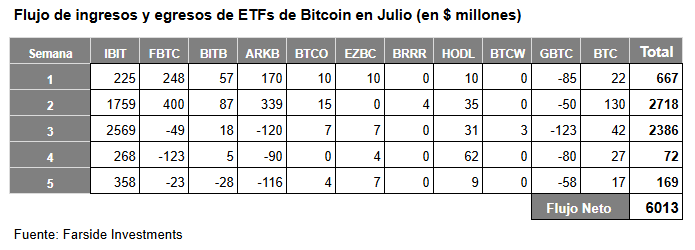 Los ETFs de Bitcoin al contado recibieron más de $6 mil millones durante Julio, consolidando su papel como uno de los vehículos preferidos para obtener exposición regulada a la cripto de referencia. Este interés sostenido refleja la creciente aceptación de Bitcoin como una clase de activo legítima dentro de las carteras diversificadas, y reafirma la importancia de los ETFs como puente entre el mundo financiero tradicional y el ecosistema cripto.