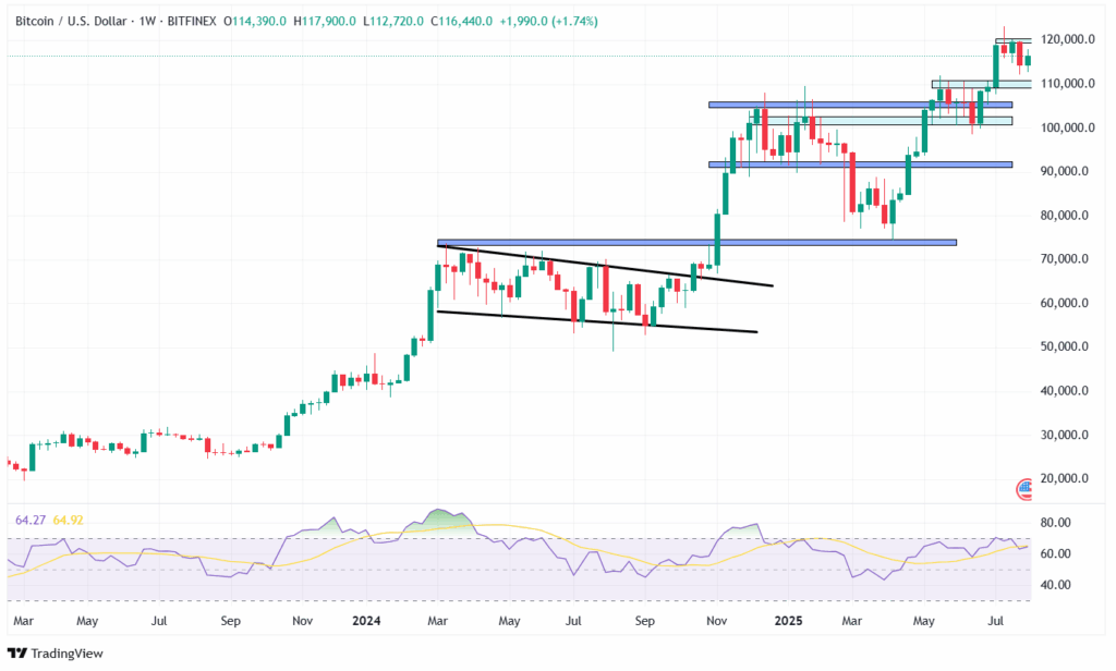 Bitcoin registró una suba del +8% en julio, alcanzando brevemente un nuevo máximo histórico de USD 123.000, antes de cerrar el mes en torno a los USD 116.000.