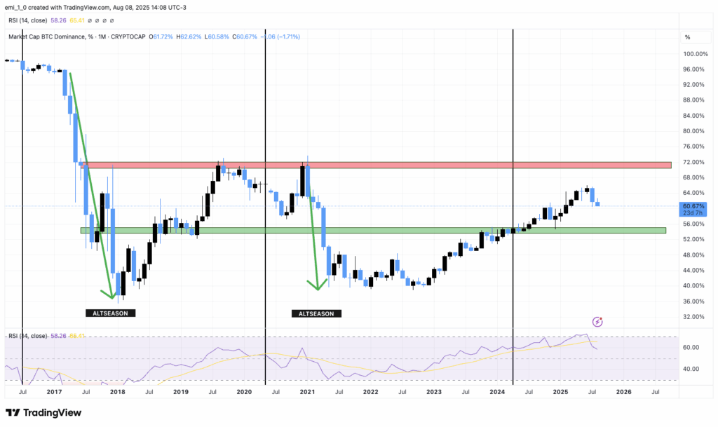La dominancia de Bitcoin (BTC.D) ha experimentado una caída significativa, situándose por debajo del 61%, corrección que se venía esperando tras haber superado el 65% a principios de año. Esta reducción indica una rotación de capital hacia las altcoins, un fenómeno típico en las fases intermedias de un ciclo alcista. La disminución de la dominancia de BTC refleja la confianza creciente en proyectos alternativos, especialmente en Ethereum, que ha mostrado un rendimiento superior al de Bitcoin en el segundo trimestre de 2025.