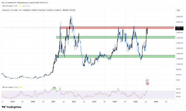 En julio, Ethereum (ETH) mostró un sólido desempeño frente al dólar estadounidense, con un aumento del 49%, alcanzando un máximo de cinco meses de $3,938.53. Este rally, uno de los más fuertes en años, fue impulsado por flujos récord de $726 millones hacia ETF de Ethereum, una narrativa técnica alcista y un creciente interés institucional.