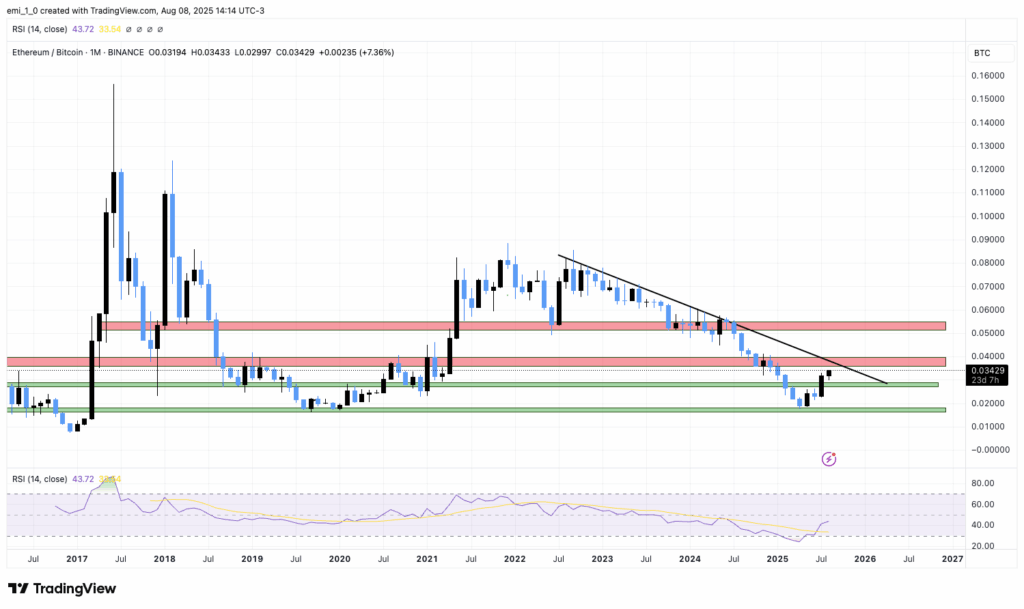 El par ETH/BTC ha mostrado una fuerte recuperación desde los mínimos alcanzados en abril del presente año. Aún queda por vender una fuerte resistencia diagonal descendente que se viene desarrollando desde hace algo más de tres años, pero las señales son sumamente positivas.