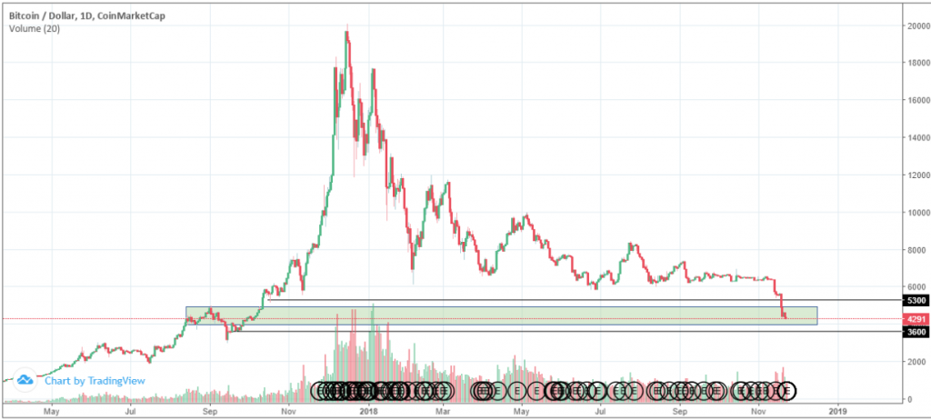 Luego del primer impulso bajista que advertimos en el anterior Newsletter, $BTC sufrió otra sustancial caída, consolidándose por encima de los USD 4.000. Actualmente los indicadores diarios se encuentran agotados y esta mañana de viernes vimos una nueva caída de menor volumen que no logró romper con el piso anterior.